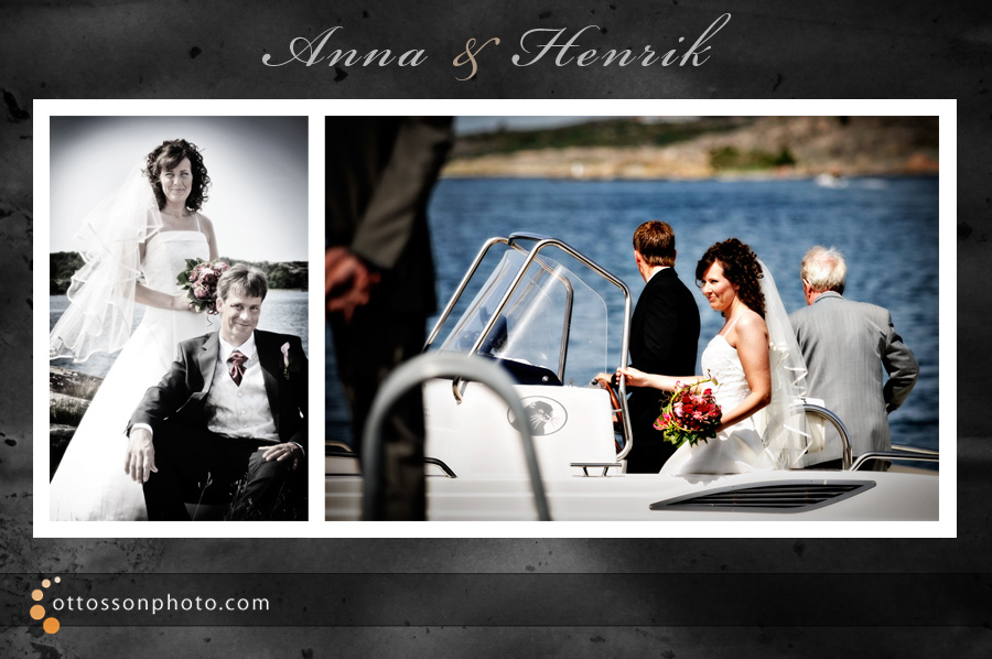 Årets tredje par var Anna & Henrik. Henrik känner jag sen förut. Jag jagade honom på ett antal fotbollsplaner under några år, som slavdrivare för Rabbalshede IK. Bröllopet fotograferade jag tillsammans med min guddotter Josefine, som gjorde ett jättebra jobb som ass. Detta bröllop får priset som vårt mest exotiska i år. Den vackra bruden kom farande i 40 knop, tillsammans med sin far i en racerbåt. Vigseln hölls på en underbar liten ö utanför Grebbestad, där brudens familj haft sitt sommarställe i alla år. Den närmaste släkten var samlad på bryggan. Ett vackert brudpar, i en vacker miljö och strålande solsken. En fantastisk dag på jobbet![]()